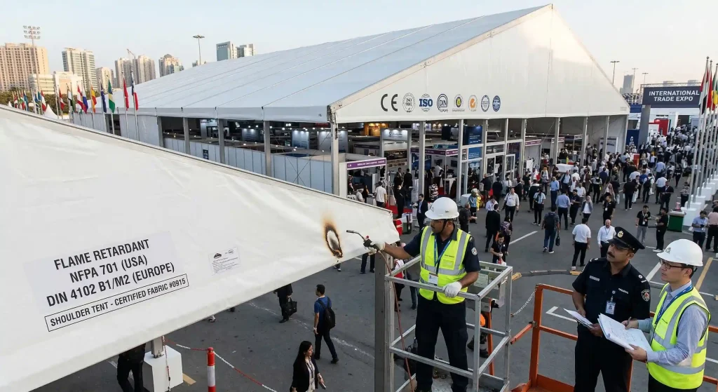 When purchasing an exhibition tent, you must demand factory certifications for flame retardancy. Premium PVC fabrics are chemically treated during the manufacturing process to meet or exceed international safety metrics: